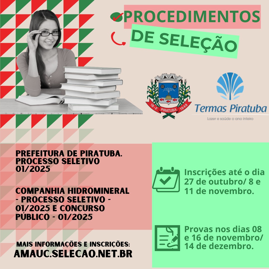 A Associação dos Municípios do Alto Uruguai Catarinense (AMAUC) informa os interessados sobre a abertura do período de inscrições para mais três processos de seleção de pessoal. Um deles é destinado à Prefeitura Municipal de Piratuba, e os outros dois à Companhia Hidromineral.